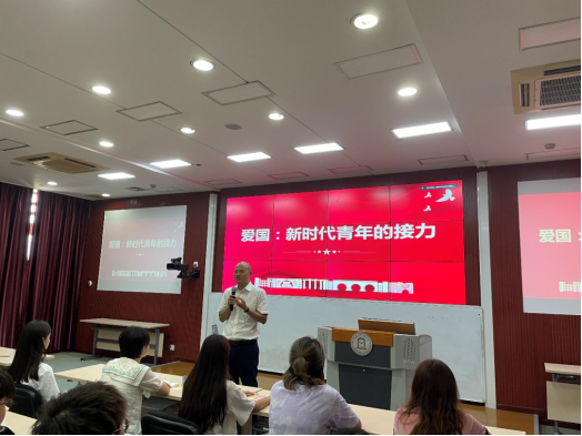 課堂第一環節由上海對外經貿大學馬克思主義學院羅國輝副教授主講,他通過古往今來的事例,從何為愛國、為什么要愛國、怎樣愛國三個方面系統講解了新時代愛國主義的內涵,以及青年大學生的愛國體現與責任擔當。