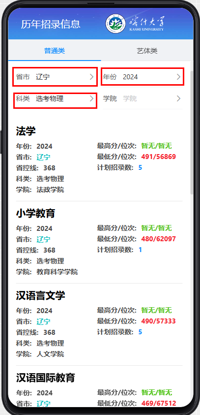 第二步:在招生政策模塊點(diǎn)擊歷年錄取信息查詢,根據(jù)省份、年份、科類等篩選后即可查詢相應(yīng)專業(yè)往年的錄取分?jǐn)?shù)。