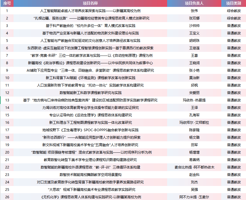 近日,自治區(qū)教育廳公示《2025年度自治區(qū)高校本科教育教學(xué)研究和改革項(xiàng)目擬立項(xiàng)名單》。喀什大學(xué)憑借26項(xiàng)本科教改項(xiàng)目獲批立項(xiàng)的亮眼成績(jī)創(chuàng)歷年新高,在自治區(qū)高校中位居前列。