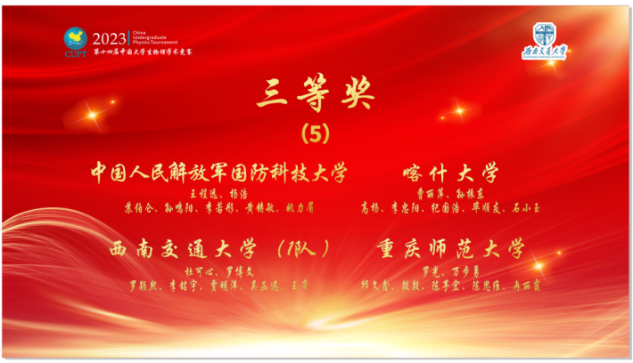 8月21日至24日,由中國(guó)大學(xué)生物理學(xué)術(shù)競(jìng)賽組委會(huì)主辦、西南交通大學(xué)和四川省物理學(xué)會(huì)承辦的第十四屆中國(guó)大學(xué)生物理學(xué)術(shù)競(jìng)賽 (CUPT) 全國(guó)賽落下帷幕。我校師生代表隊(duì)首次參加CUPT國(guó)賽,榮獲競(jìng)賽團(tuán)隊(duì)三等獎(jiǎng),物理學(xué)專業(yè)大一學(xué)生石小玉榮獲“最佳評(píng)論方”競(jìng)賽個(gè)人獎(jiǎng),為我校贏得了榮譽(yù)。
