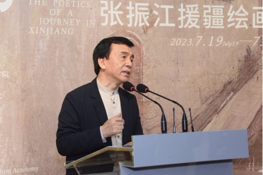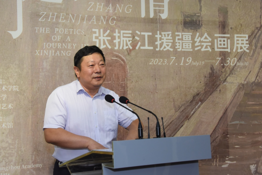 叢培兵代表喀什大學致辭。他高度肯定了張振江教授在援疆期間對喀什大學美術教育發展做出的積極貢獻。他表示,張振江教授的創作以新疆豐富的文化元素、各族人民生動的生產生活場景為源泉;以大美新疆為主題;有著獨特而濃厚的人文情懷。同時以新表現主義的獨特藝術視角,詮釋了新疆多維度的發展,民族團結與社會和諧。本次援疆繪畫展,也正是對“文化潤疆”工程的積極踐行,是張振江教授深入新疆、行走新疆的工作實踐和生活體驗,記錄了一個個體對于新時代新疆社會、人文、自然的深切觀照。預祝本次援疆繪畫展圓滿成功!