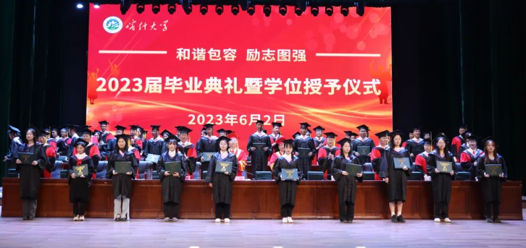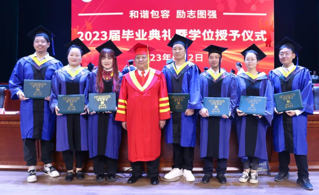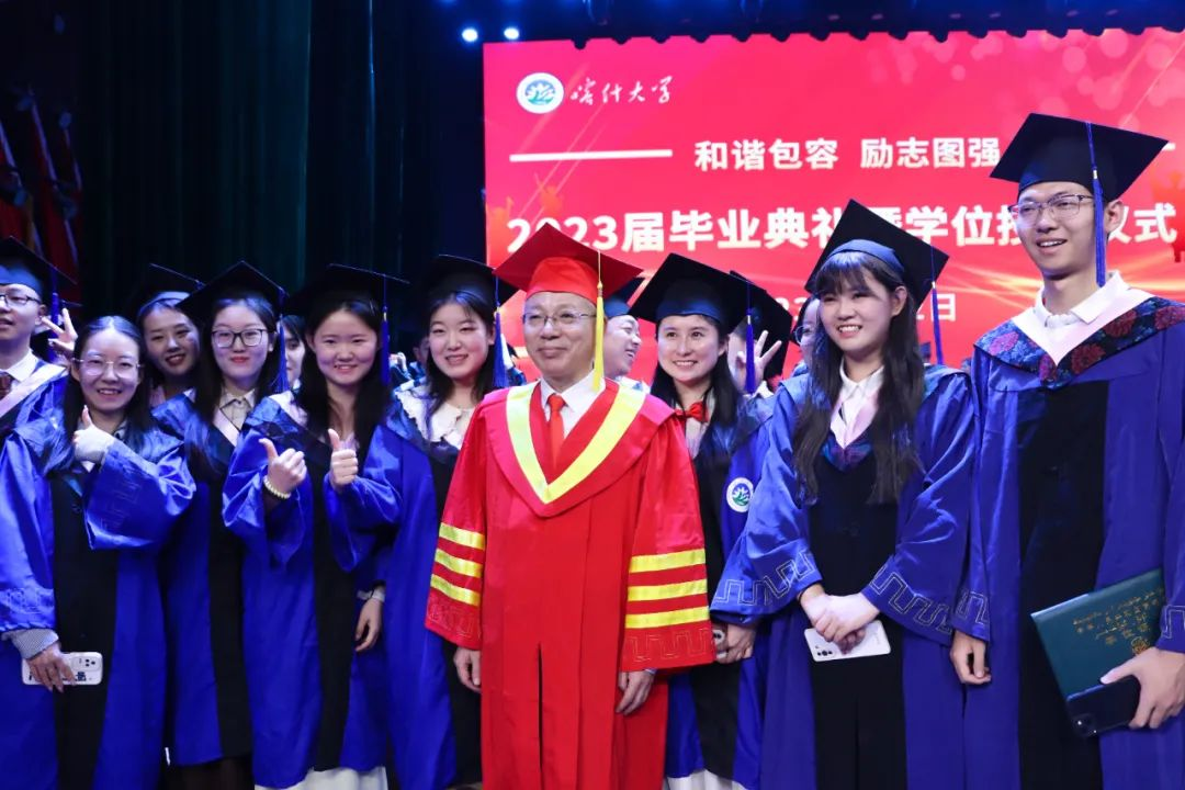 校領導、學位委員會委員和導師代表向2023屆畢業生們撥穗正冠,頒授學位證書,并合影留念。
