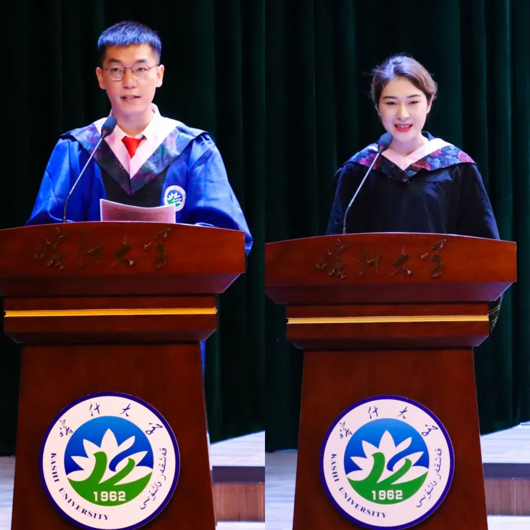 白科、地拉熱·麥麥提艾力代表畢業生對母校領導和老師的辛勤培育表示感謝,向一起在喀大走過青春歲月的同學表達惜別之情。他們表示一定將喀大所學回報社會,走好自己的人生路,以優異的成績回報母校的培養。